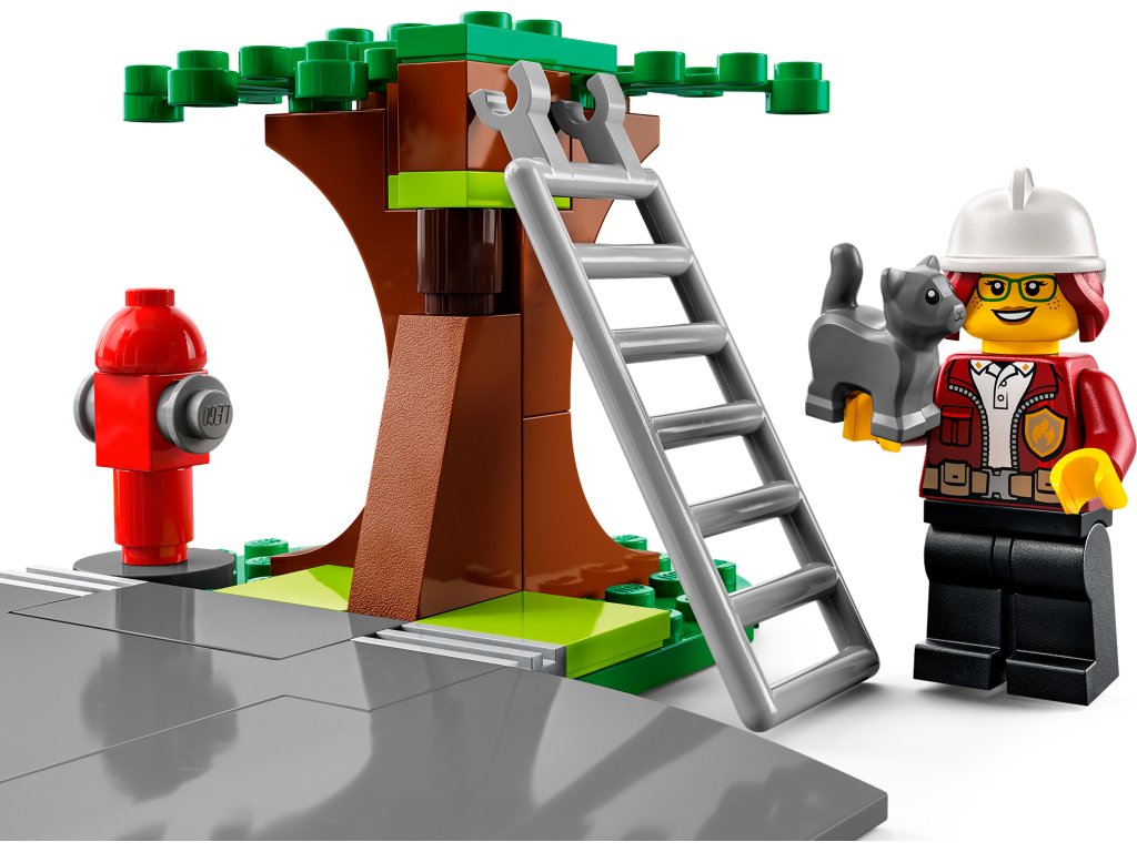 - minifigurky hasičů, včetně 2 postav z LEGO City TV, k tomu figurka kočky a psa