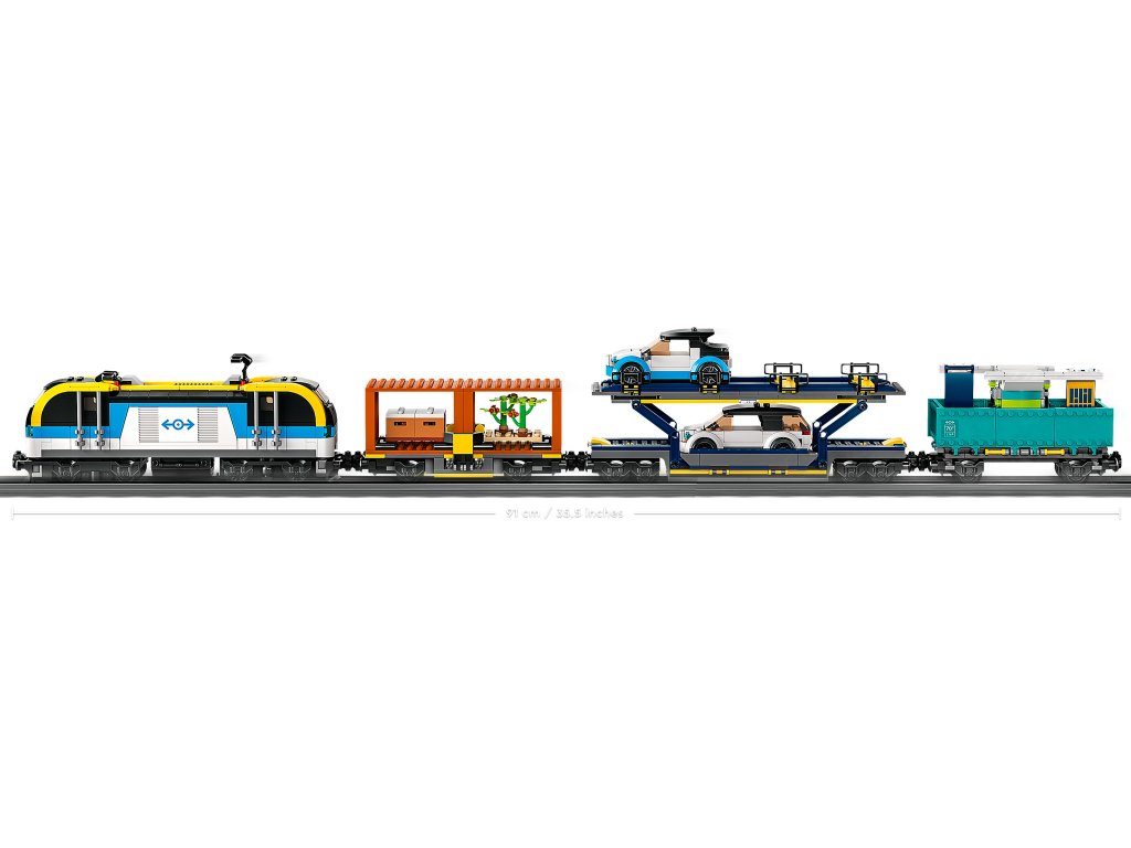 - Rozměry – nákladní vlak LEGO® City měří 9 cm na výšku, 90 cm na délku a 6 cm na šířku