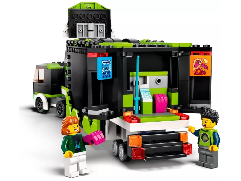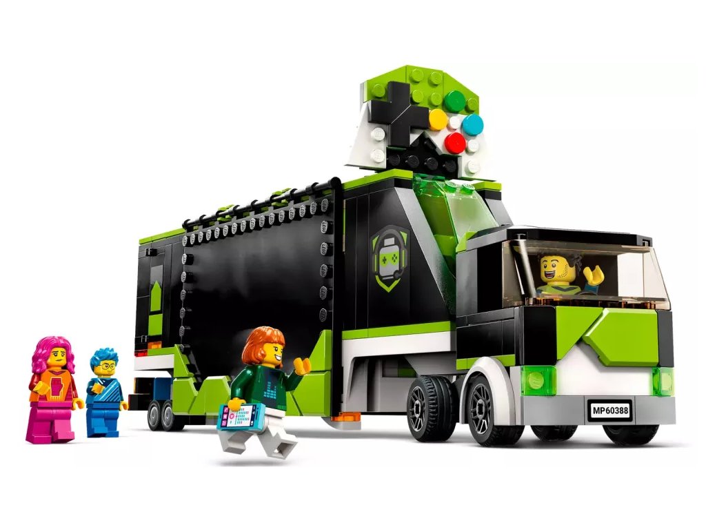 - Co se ukrývá v krabici? – Vše, co děti potřebují k sestavení kamionu a herního turnaje, včetně pódia, 2 herních stanic a velkoplošné obrazovky. Chybět nesmí ani trofej pro vítěze, zboží pro fanoušky a 3 minifigurky