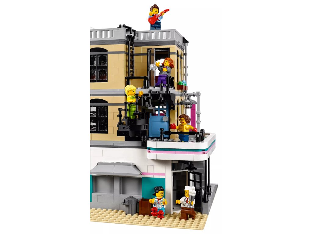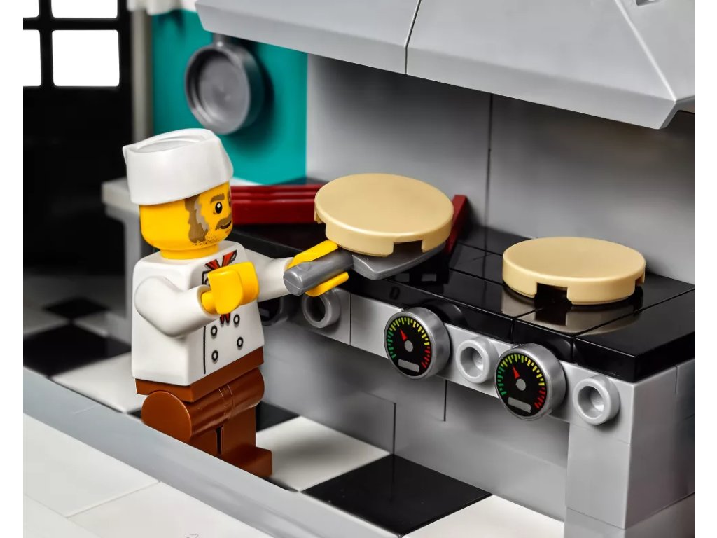Zastav se v Restauraci v centru města LEGO® Creator Expert 10260, kde objevíš zdravou porci zábavy a překvapení. Části budovy tohoto působivého modelu se dají rozložit. Díky tomu se snadno dostaneš k propracovanému interiéru restaurace ve stylu 50. let s velkým obloukovým oknem, červenými barovými židlemi, jukeboxem, pultem a otevřenou kuchyní v přízemí. Na prostředním patře na tebe čeká posilovna s boxerským ringem, boxovacím pytlem a místností s vybavením pro vzpěrače a v posledním patře najdeš nahrávací studio vybavené akustickou kabinou, mixážním pultem a skříňkou s občerstvením. Fasáda budovy je vyvedená ve stylu Art deco v růžové a tyrkysové barvě a zdobí ji velký nápis „RESTAURACE“. Zvenku má budova klenutá okna, balkóny a schodiště a k sadě patří i růžový skládací kabriolet a propracovaný chodník s poštovní schránkou, parkovacím automatem, květináči a pouliční lampou. Tato úžasná sběratelská hračka byla navržena tak, aby její skládání bylo výzvou a zároveň ti přinášelo obohacující zážitek s nádechem nostalgie a šarmu. Sada obsahuje 6 minifigurek.