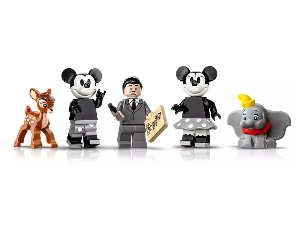 - Známé postavičky – Ve stavebnici nechybí 3 minifigurky LEGO® ǀ Disney: Myšák Mickey, Myška Minnie a Walt Disney, a figurky zvířat LEGO Bambi a Dumbo
