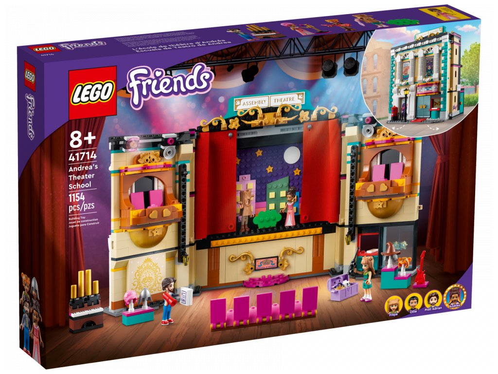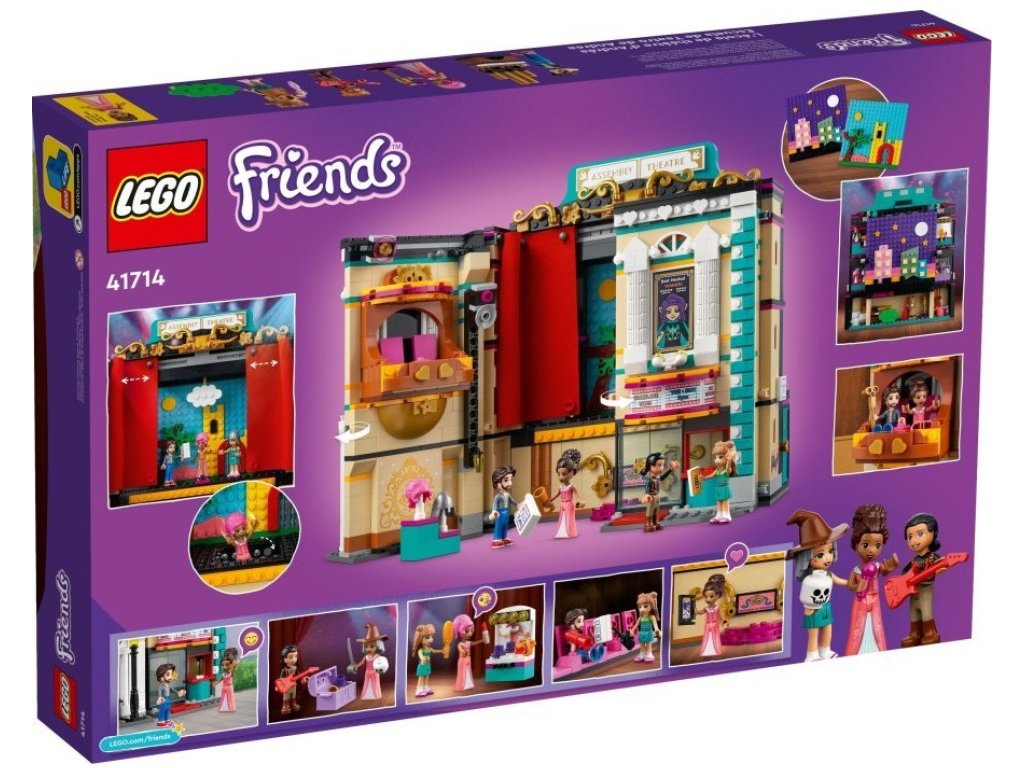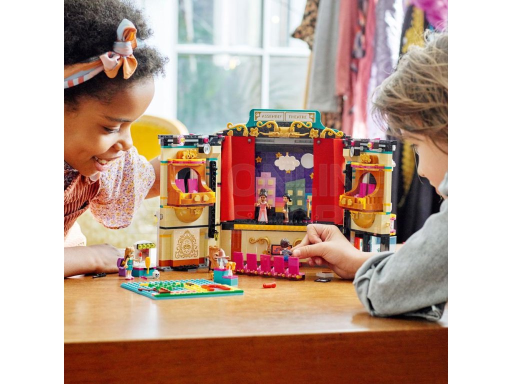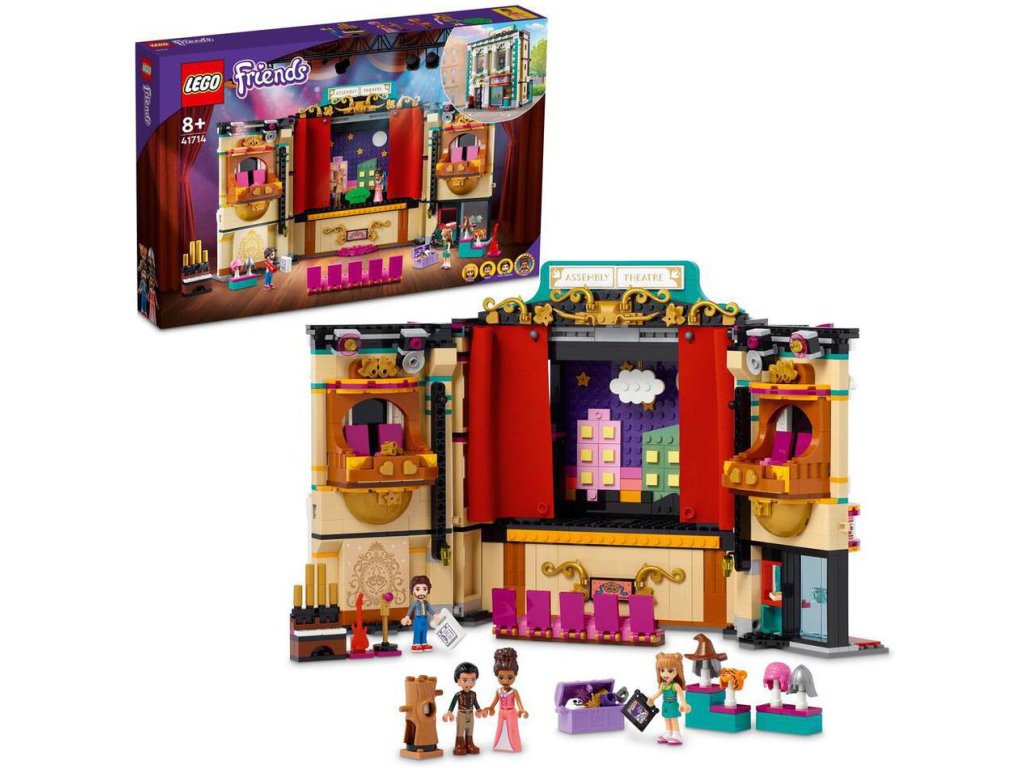 Za viktoriánskou fasádou se ukrývá divadlo, včetně předních křesel v přízemí a balkónu. Odhrňte látkovou oponu a pokochejte se 2 scenériemi – středověkým hradem a nočním městem. Otočte divadlo a prohlédněte si osvětlovací techniku a šatnu, kde se postavy připravují na vystoupení – úplně jako ve skutečnosti! Nechybí ani rekvizity, s nimiž si děti budou moct vymýšlet vlastní dramatické scény. Kamarádky LEGO® Friends Andrea, Ollie a Freya mohou pilovat své herecké party pod vedením profesora Adriana.