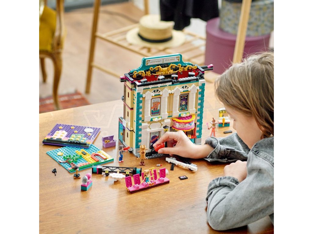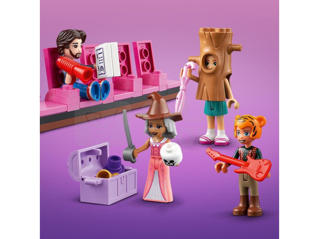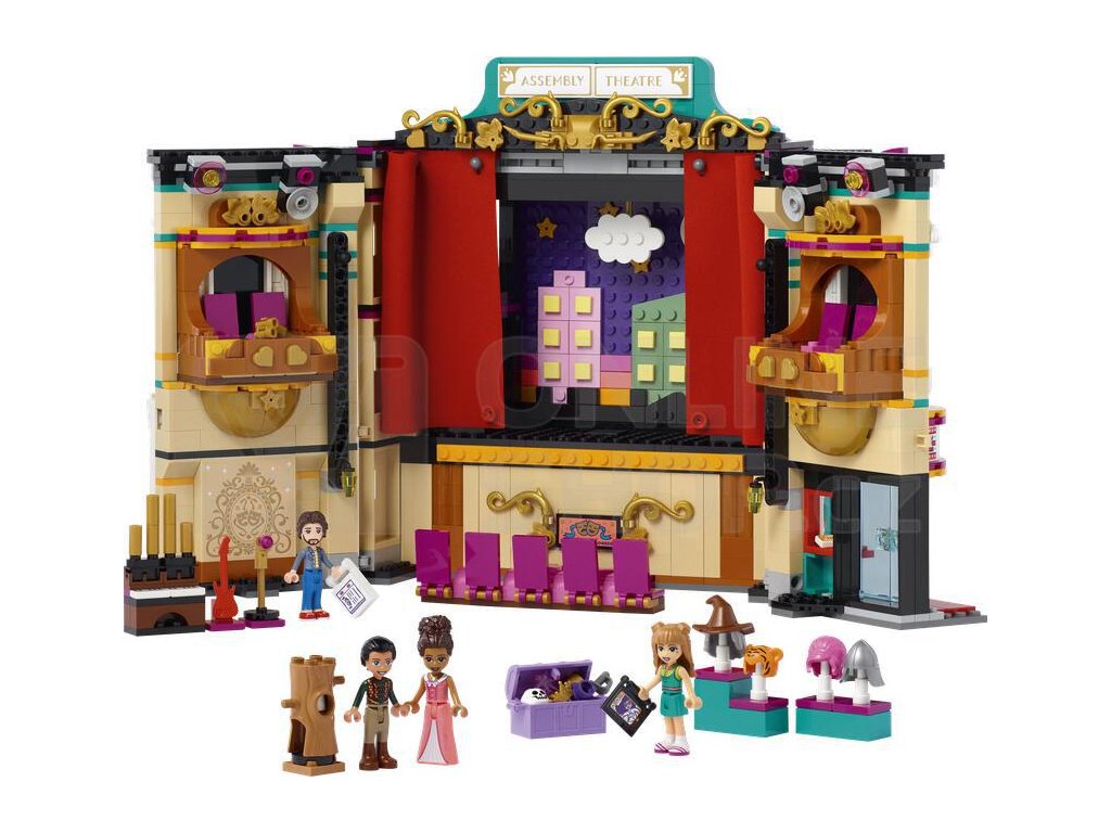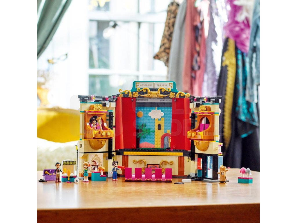 Za viktoriánskou fasádou se ukrývá divadlo, včetně předních křesel v přízemí a balkónu. Odhrňte látkovou oponu a pokochejte se 2 scenériemi – středověkým hradem a nočním městem. Otočte divadlo a prohlédněte si osvětlovací techniku a šatnu, kde se postavy připravují na vystoupení – úplně jako ve skutečnosti! Nechybí ani rekvizity, s nimiž si děti budou moct vymýšlet vlastní dramatické scény. Kamarádky LEGO® Friends Andrea, Ollie a Freya mohou pilovat své herecké party pod vedením profesora Adriana.