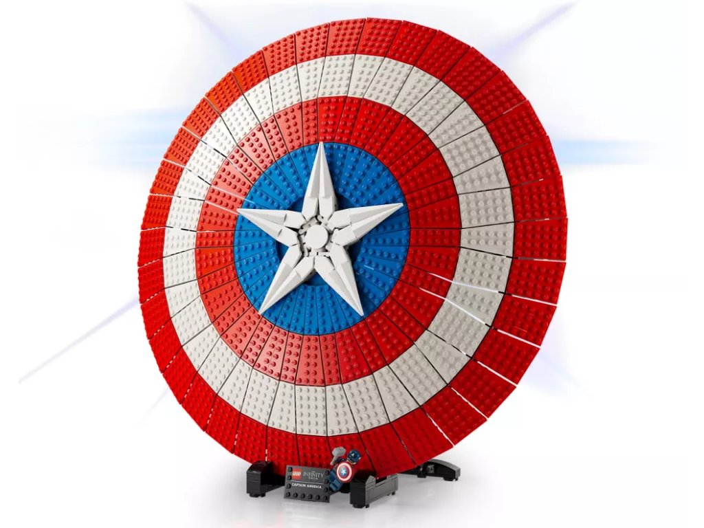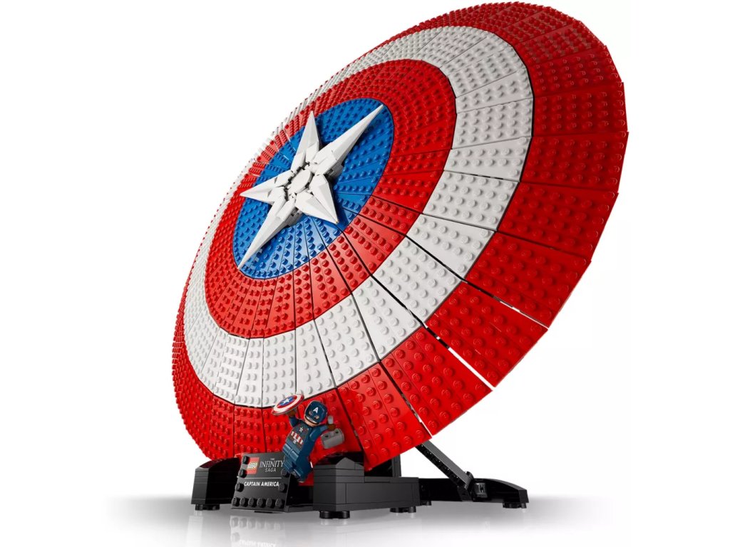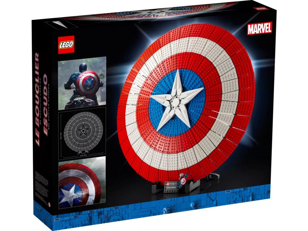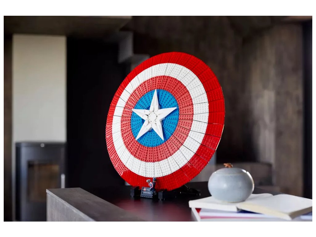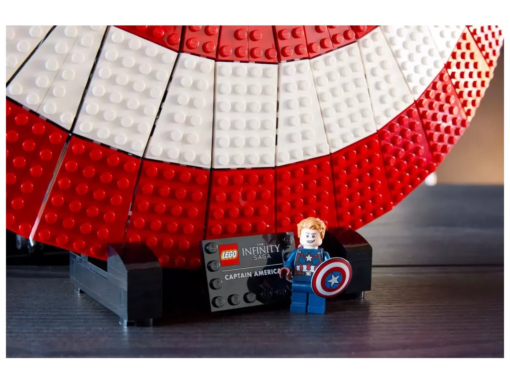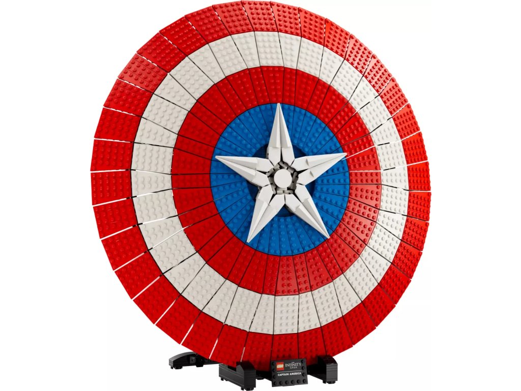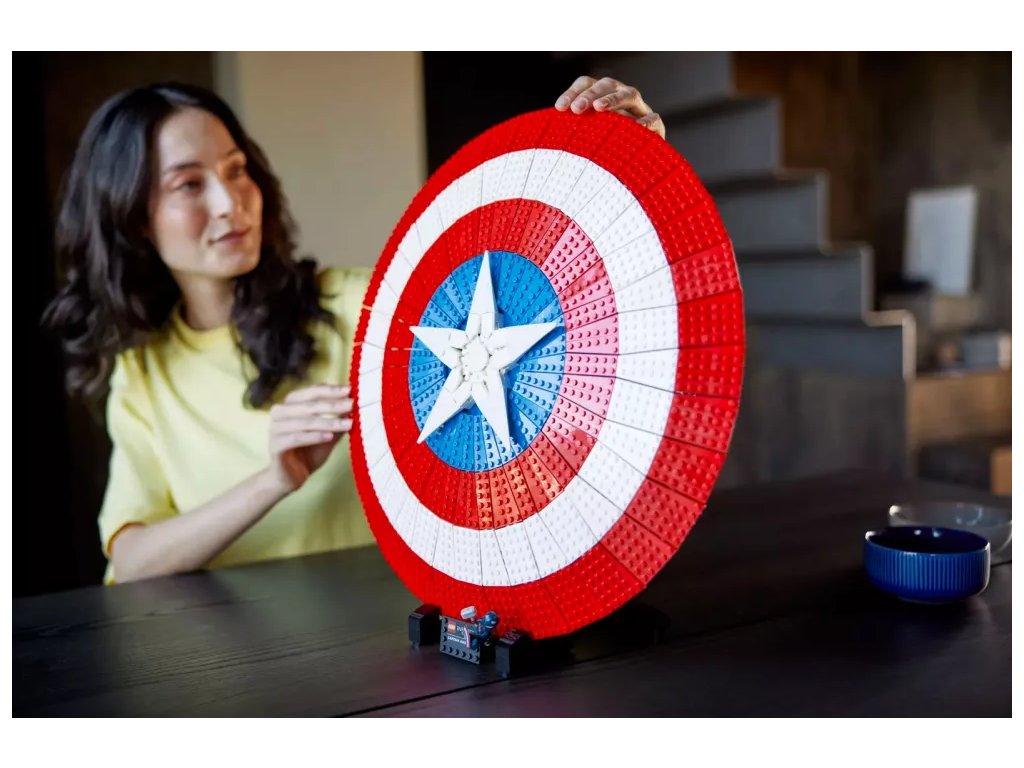 - Připravený k vystavení – Štít je umístěn na podstavci s jmenovkou a součástí je minifigurka Kapitána Ameriky s vlastním štítem a Thorovým kladivem Mjölnirem