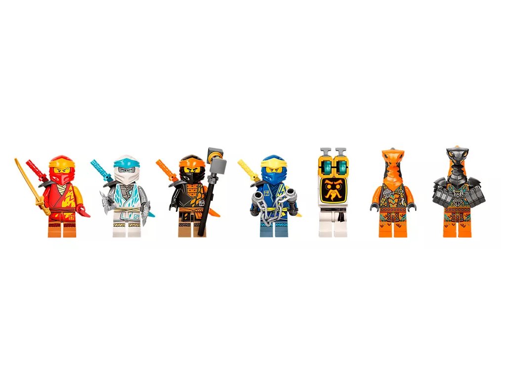 Tato úchvatná stavebnice zahrnuje 7 minifigurek: Kaie, Jaye, Zanea a Colea, ale také Wu Bota a duo padouchů v podobě kobřího mechanika a hroznýšího ničitele, aby si děti mohly přehrávat strhující bitvy. Jedná se o novinku na leden 2022. Až děti porazí protivníky nindžů a dokončí misi, dostanou za odměnu sběratelský banner.
